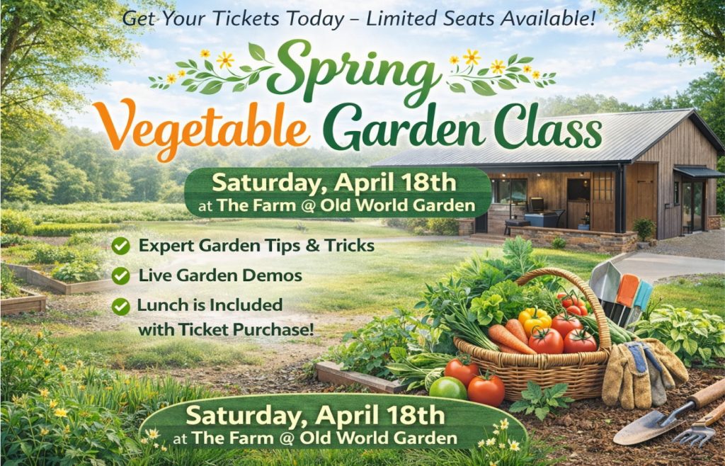 Get Your Tickets Now For Our 2026 Spring Garden Class At The Farm On April 18th! Learn Our Top Tips & Tricks For How To Grow The Vegetable Garden Of Your Dreams – Without The Weeds! Lunch is included with your ticket – and it will be a day filled with practical learning, helpful tips, and down-to-earth gardening advice – all in the comfort of our brand new event center at the farm! Get Your Tickets Here: 2026 Old World Garden Garden Class
