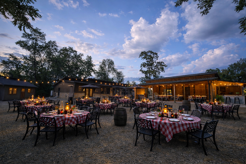 Includes Barn, Courtyard & Bar Area (Does not include use of grills, fireplace and fire pits). Tables and chairs provided for up to 50 guests. Additional tables/chairs available for an additional fee – $10 per table/$2 per chair. All events must end by 10 p.m.
